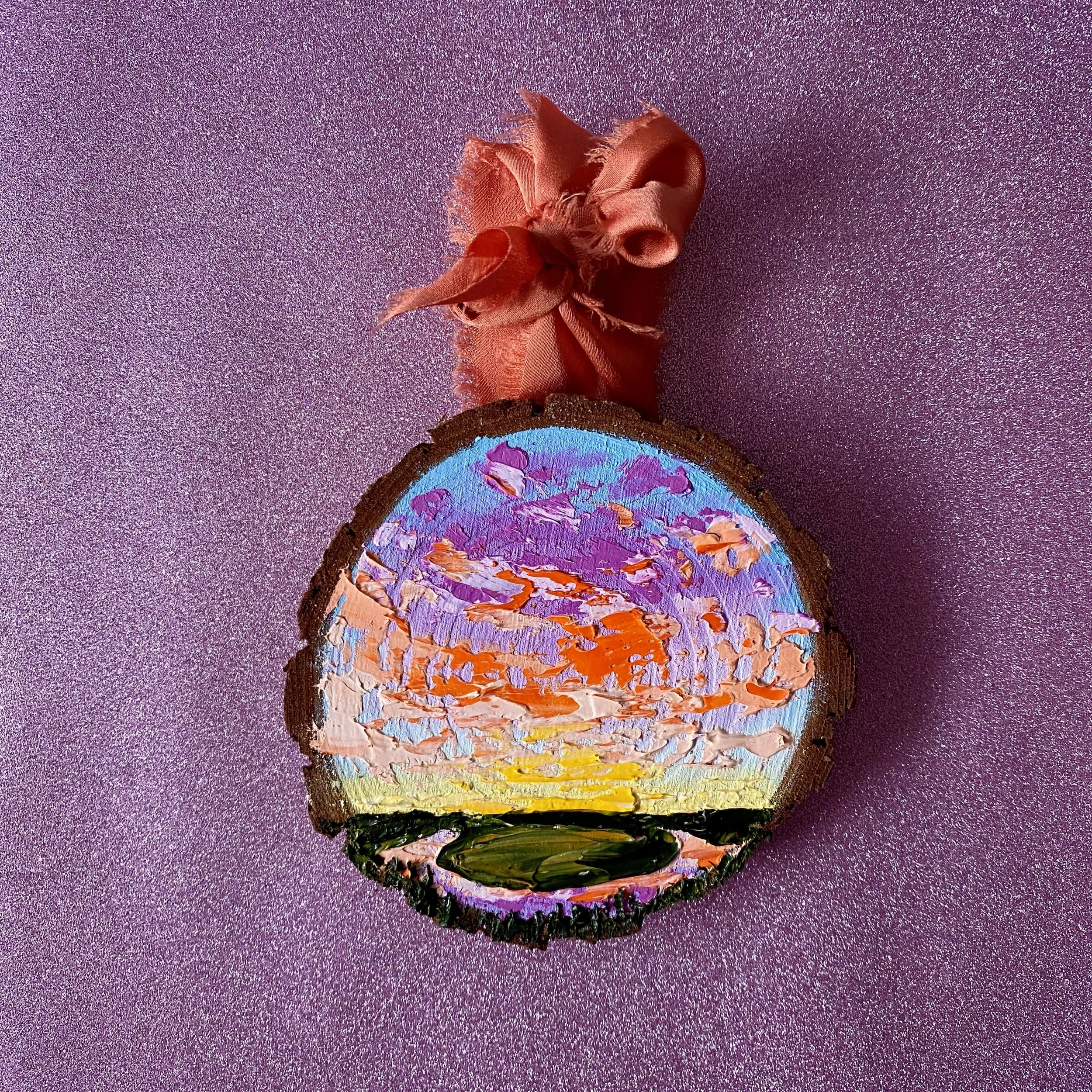 Ornaments are 3” - 4” diameter wood cookies. They come with a sawtooth hanger fixed on the back, and matching ribbon to hang with.